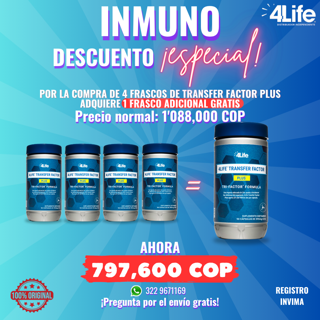 Por la compra de 4 frascos de Transfer Factor Plus a $199,400 c/u 👉 recibes 1 frasco GRATIS.